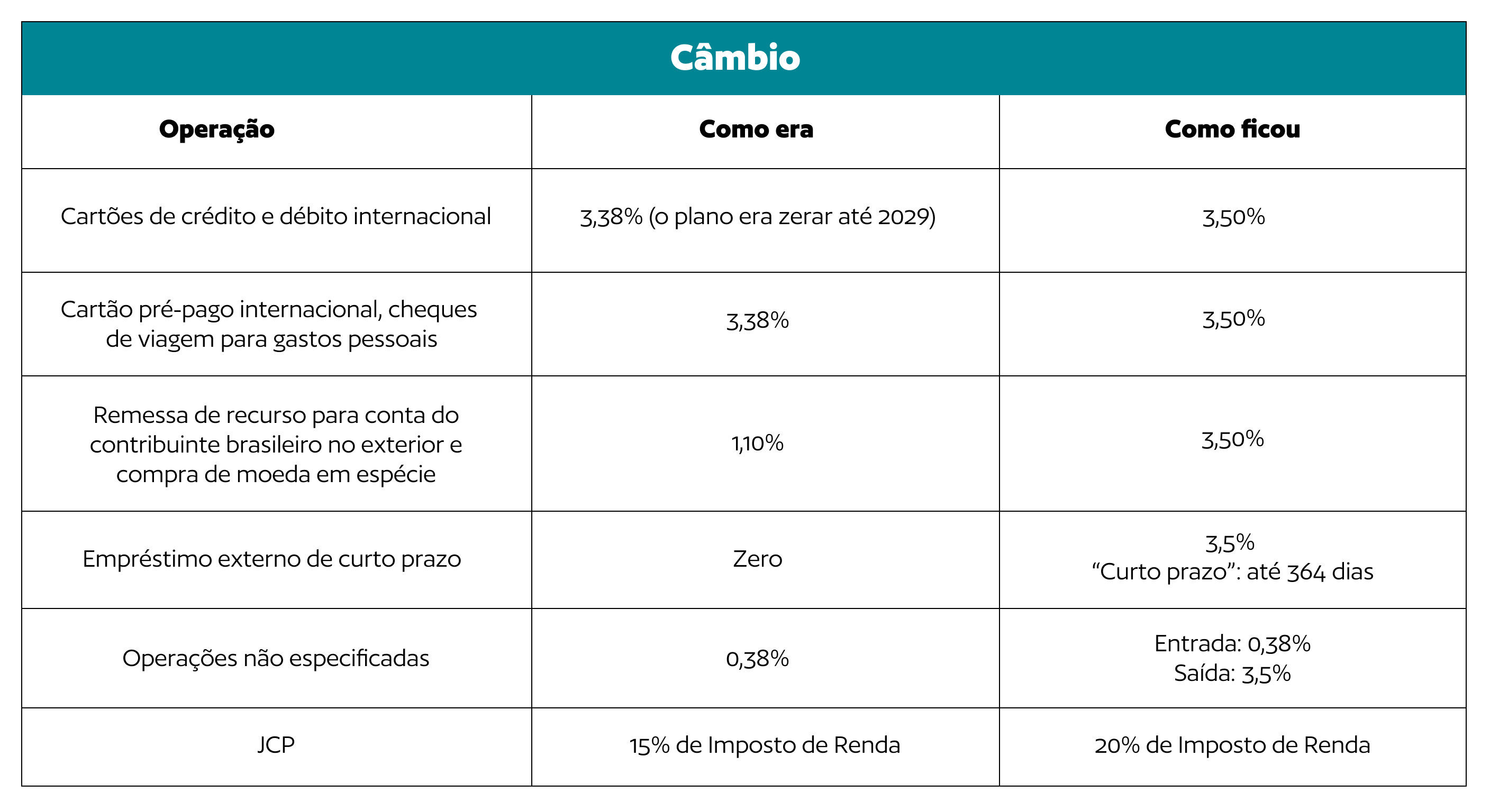 Uma das mudanças mais relevantes foi o aumento da alíquota do IOF para 3,5% em diversas operações de saída de recursos do país, como: