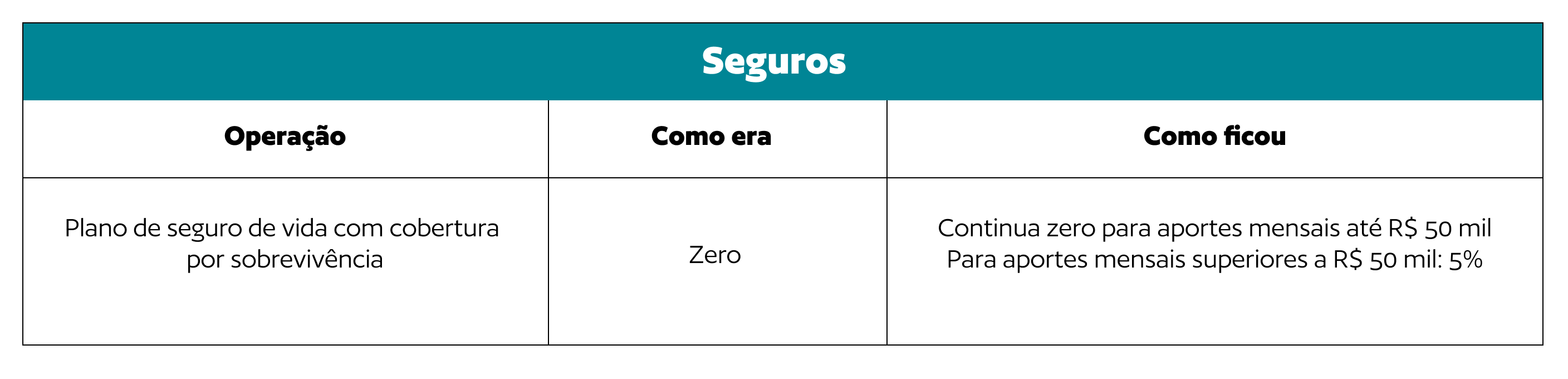Por fim, foi instituída alíquota de 5% sobre aportes mensais superiores a R$ 50 mil em planos de seguro de vida com cobertura por sobrevivência (VGBL), mesmo que destinados a segurados distintos. Antes, tais aportes eram isentos.